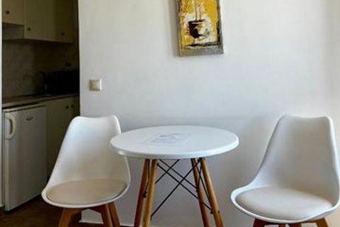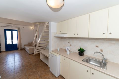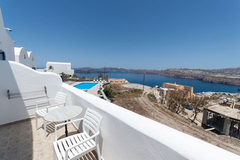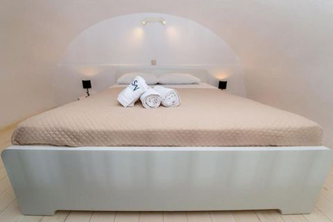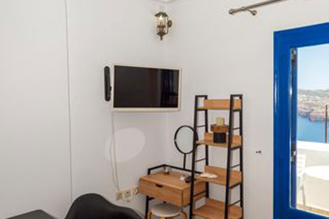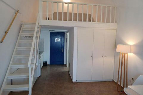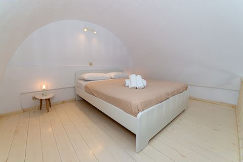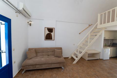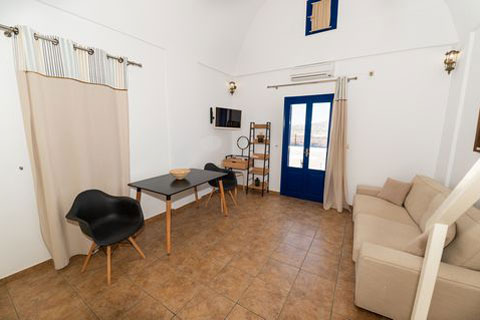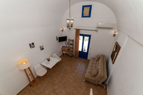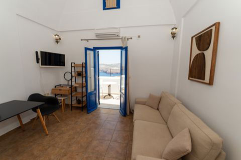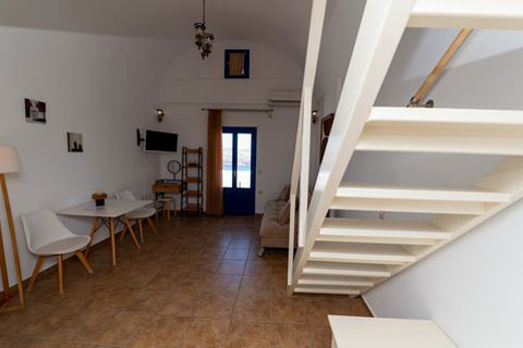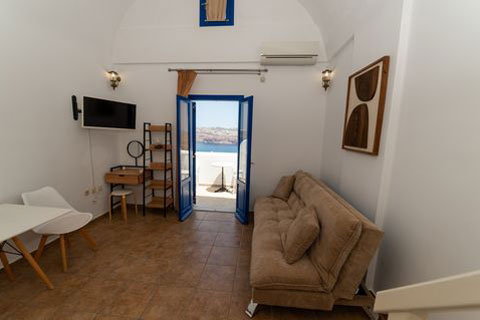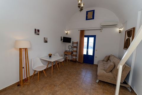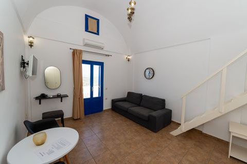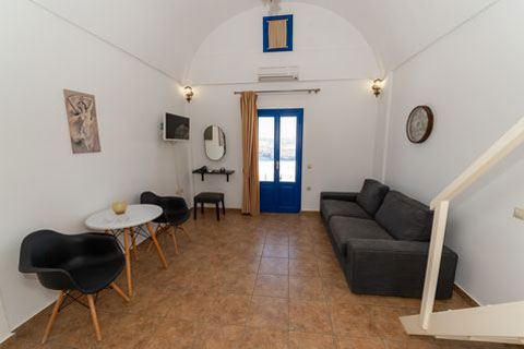 Αυτο το διαμέρισμα βρίσκεται στο πρώτο όροφο του καταλύματος και μπορεί να φιλοξενήσει 2 ή 3 άτομα. Ειναι ένα παραδοσιακά διακοσμημένο δωμάτιο με ξύλινο πατάρι όπου βρίσκεται το διπλό κρεβατι. Στο κάτω επίπεδο του δωματιου βρίσκεται ένας καναπές κρεβατι, τραπεζαρία και το μπάνιο. Απο το ιδιωτικό μπαλκόνι θα μπορείτε να απολαύσετε την μαγευτική θέα στη καλντέρα και στο Αιγαίο πέλαγος. Σε αυτό τον τύπο δωματίου δεν υπάρχει κουζίνα.